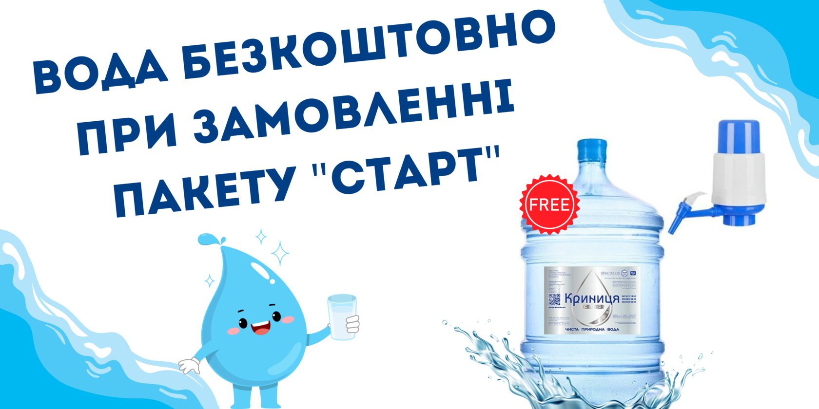 При замовленні пакету "Старт" з якісною механічною помпою, вода від ТМ Криниця йде у подарунок! Замовляйте зараз та насолоджуйтесь смачною та корисною джерельною водою!